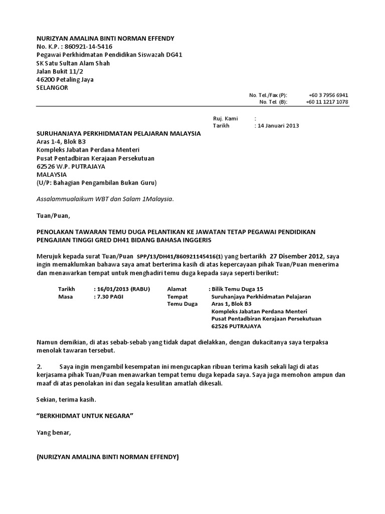 Contoh Surat Penolakan Tawaran Temuduga Romeoqwex