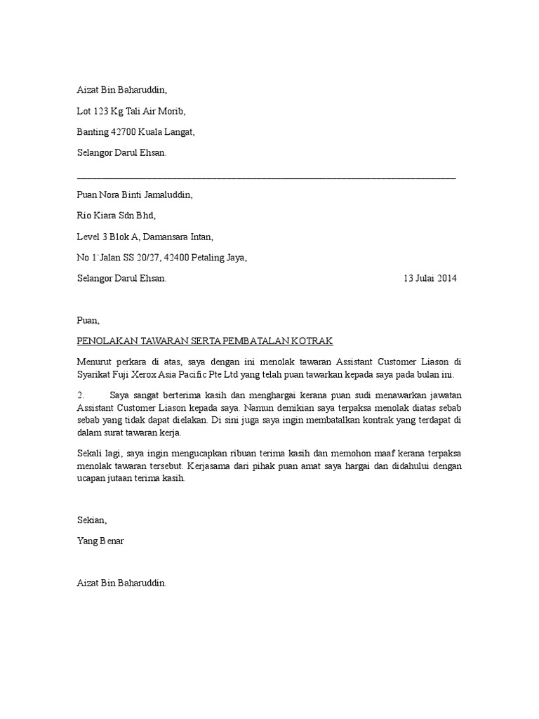 Contoh Surat Tolak Tawaran Kerja Dalam Bahasa Inggeris Contoh Surat