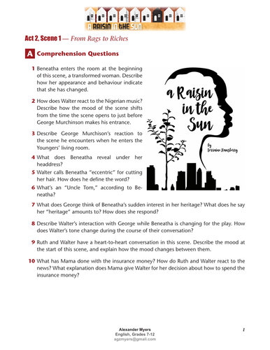 Igcse Ib A Raisin In The Sun Hansberry Act 2 Scene 1 Worksheet Answers Teaching Resources